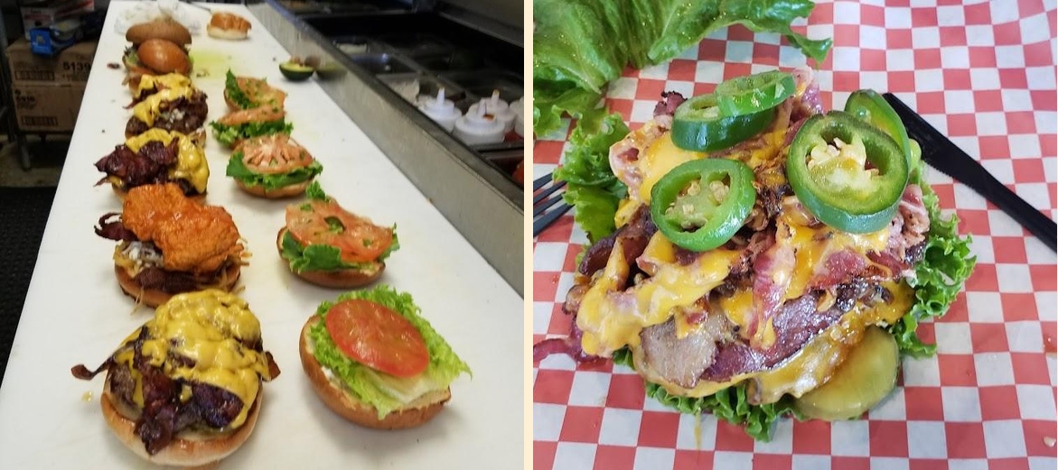 The menu includes a variety of burgers like Shroomy Swiss, Fuego, and Scottie. Each burger showcases unique flavors. Vegetarian options are also available.