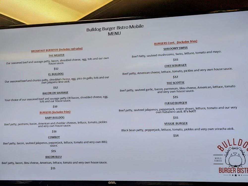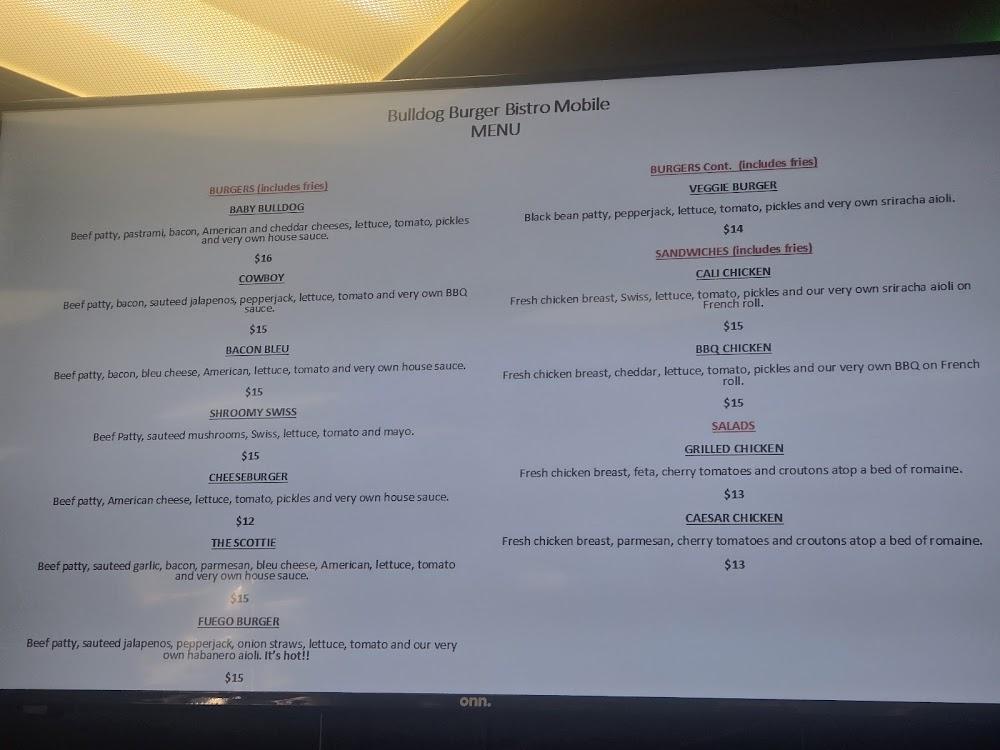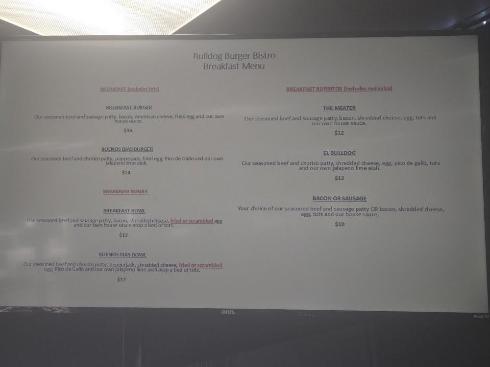 Bulldog Burger Bistro's menu features a diverse selection of American comfort food. Expect classic burgers, including the Shroomy Swiss and Cowboy. Breakfast options include burritos and bowls, perfect for early risers. Salads provide lighter choices for health-conscious diners. Enjoy unique sandwiches like the Pastrami or BBQ Chicken. Prices are reasonable, averaging around $14, attracting a varied crowd. The extensive burger lineup ensures there's something for all tastes. Vegetarian options, such as veggie burgers, cater to different dietary needs. Dishes like chili cheese fries add a comforting touch. Overall, variety stands out.”]}],